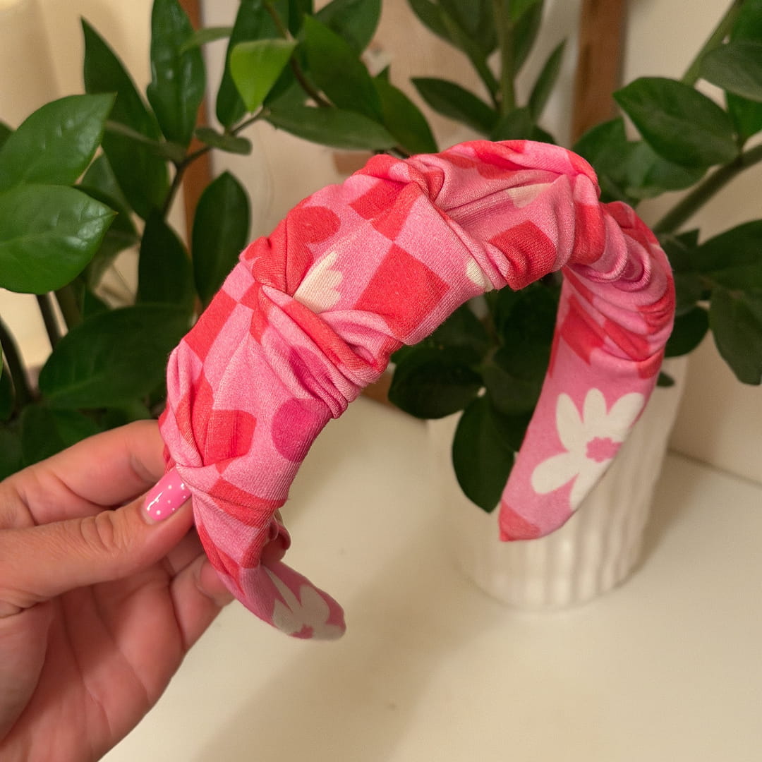Bawełniana opaska do włosów Różowa Szachownica