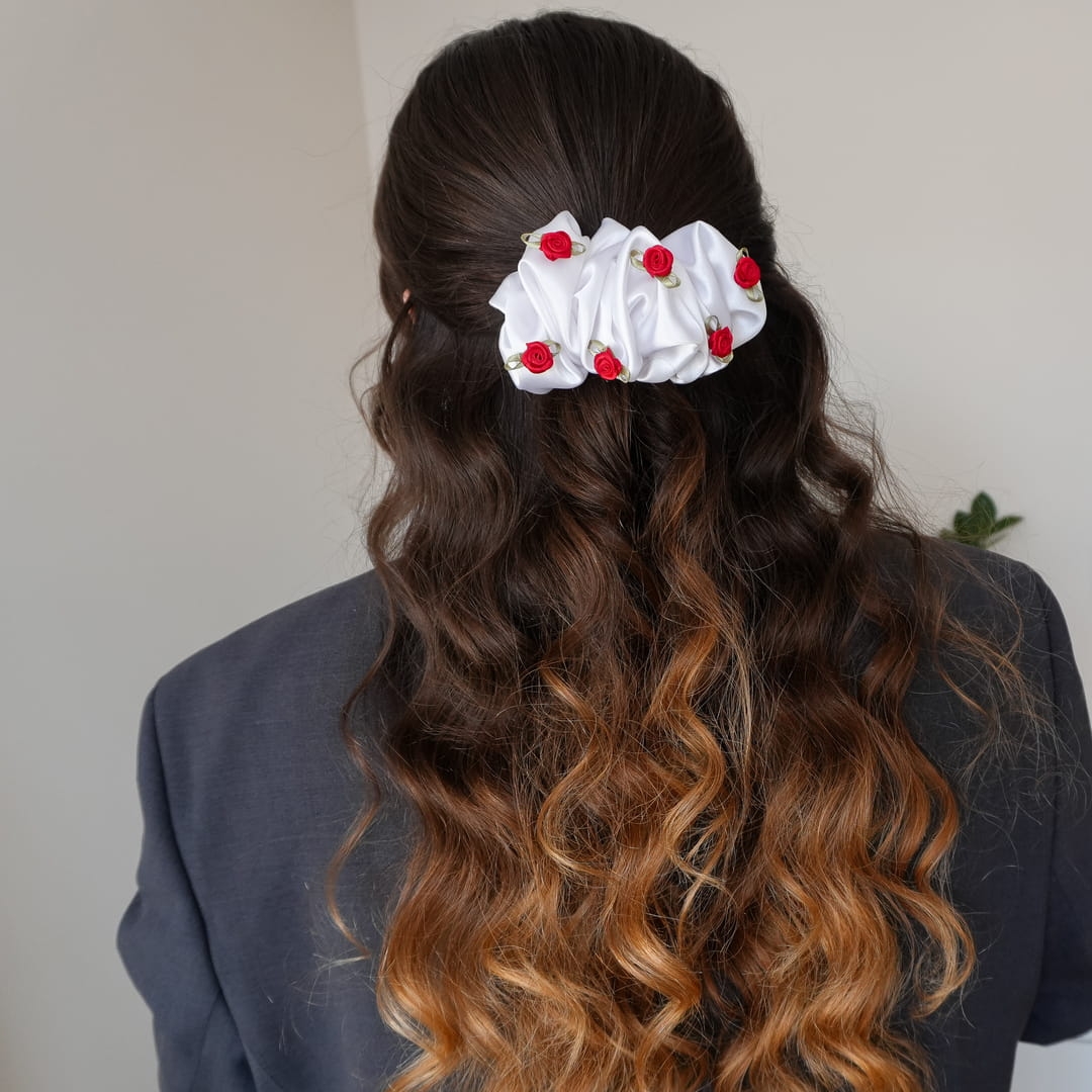 Elegancka spinka klamerka do włosów scrunchie biała z czerwonymi różyczkami