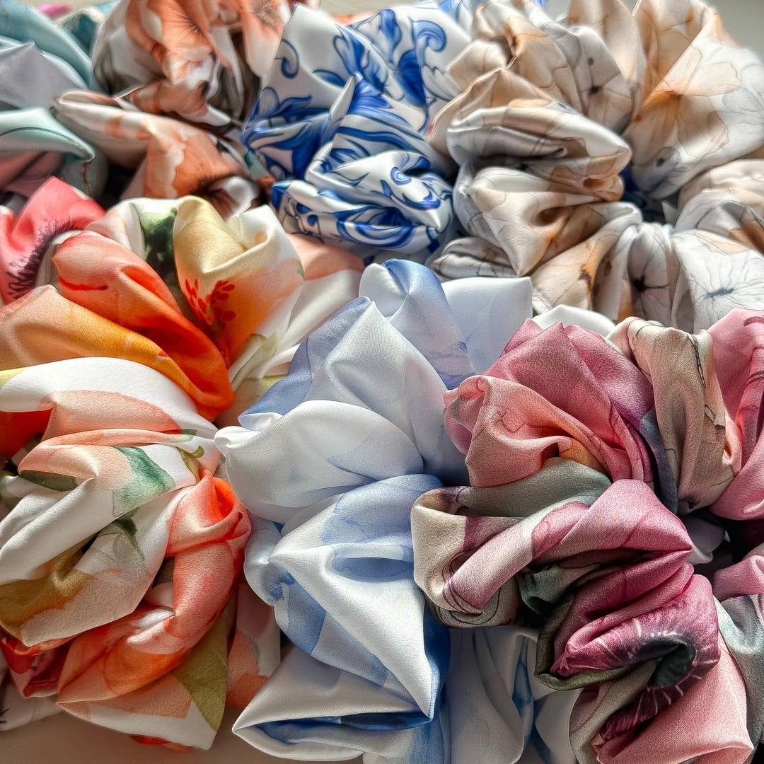 Nasze scrunchie są idealne dla osób zarówno z cienkimi, jak i gęstymi włosami, spośród 5 rozmiarów scrunchie - sugeruj się ilością użytego materiału ozdobnego (gumka użyta do scrunchie jest tej samej długości)