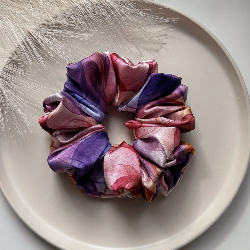 Gumka do włosów scrunchie a'la jedwab Fioletowe Kwiaty XL